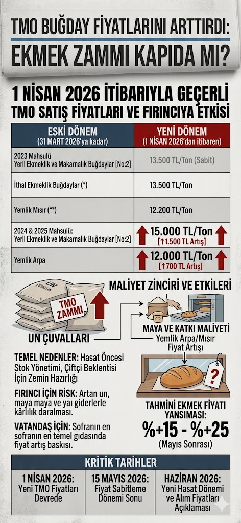 Toprak Mahsulleri Ofisi (TMO), 1 Nisan 2026 itibarıyla yayınladığı yeni satış listesiyle hububat fiyatlarında sessiz sedasız bir kırılmaya imza attı. Tabloya bakıldığında "piyasa düzenlemesi" gibi görünen bu rakamlar, aslında fırıncı esnafı için un çuvalına gelecek yeni zamların ve dolayısıyla ekmek fiyatlarındaki artış baskısının resmileşmiş hali.